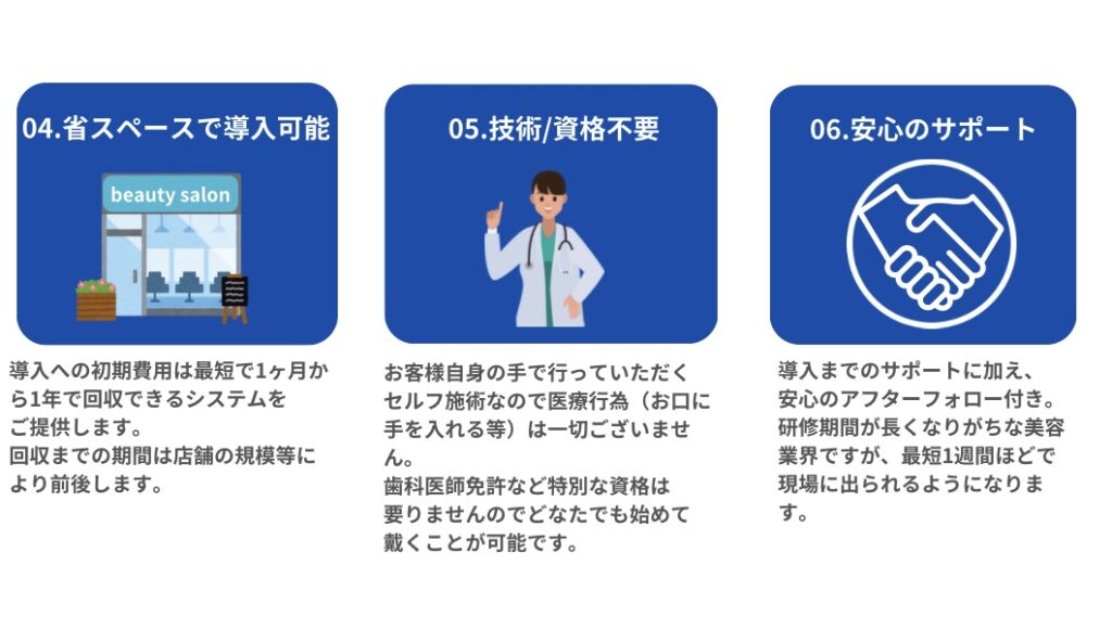歯の悩みは誰にも言えず悩んでいる人が多く1人で悩みを抱えてるケースがほとんどです。 当店ではお客様が安心して施術できるようお客様の悩みに寄り添い、しっかりとカウンセリングいたします。安心して行っていただけるよう完全セルフではなく、半セルフにてお客様との一定の距離を保ちながら行っています。