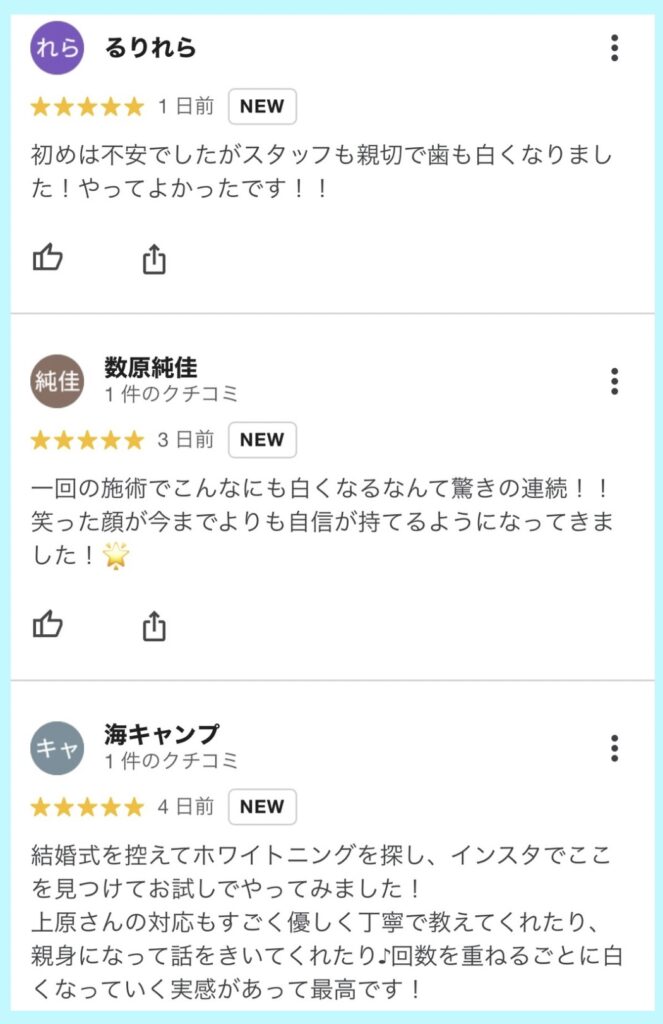 他店とは大きく違い、結果にこだわり、安心・安全・最高品質のホワイトニングジェルを使用しております。 そのwhitening効果が認められ、沖縄県は名護、離島、また県外のお客様もいらっしゃいます。 お客様一人一人の状況に合わせた最適なプランのご提案させて頂き、whitening効果に満足していただいております。 そのため初回お客様満足度98%、リピート率は85%以上とGoogle口コミも高評価。